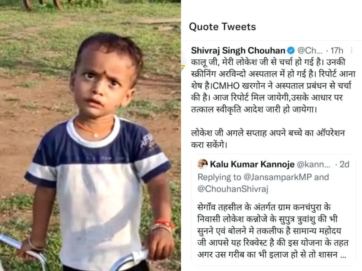 गौरतलब है कि लोकेश के परिवार के साथ-साथ उनके दोस्त भी परेशान थे कि आखिर बच्चे का इलाज कैसे कराया जाए. इस दौरान खरगोन जनसंपर्क के फेसबुक अकाउंट से जानकारी मिली की भीकनगांव की एक बच्ची भी ऐसी ही समस्या से परेशान है और प्रशासन उसका इलाज फ्री करा रहा है. ये देख लोकेश के मित्र शुभम पटेल ने इस पोस्ट पर कंमेंट किया. साथ ही. लोकेश के मित्र कालू कन्नोजे ने मुख्यमंत्री को ट्वीटर पर टैग कर पोस्ट की. ये ट्वीट देख मुख्यमंत्री चौहान ने इसे तत्काल संज्ञान में लिया और कलेक्टर कुमार पुरुषोत्तम से चर्चा की.