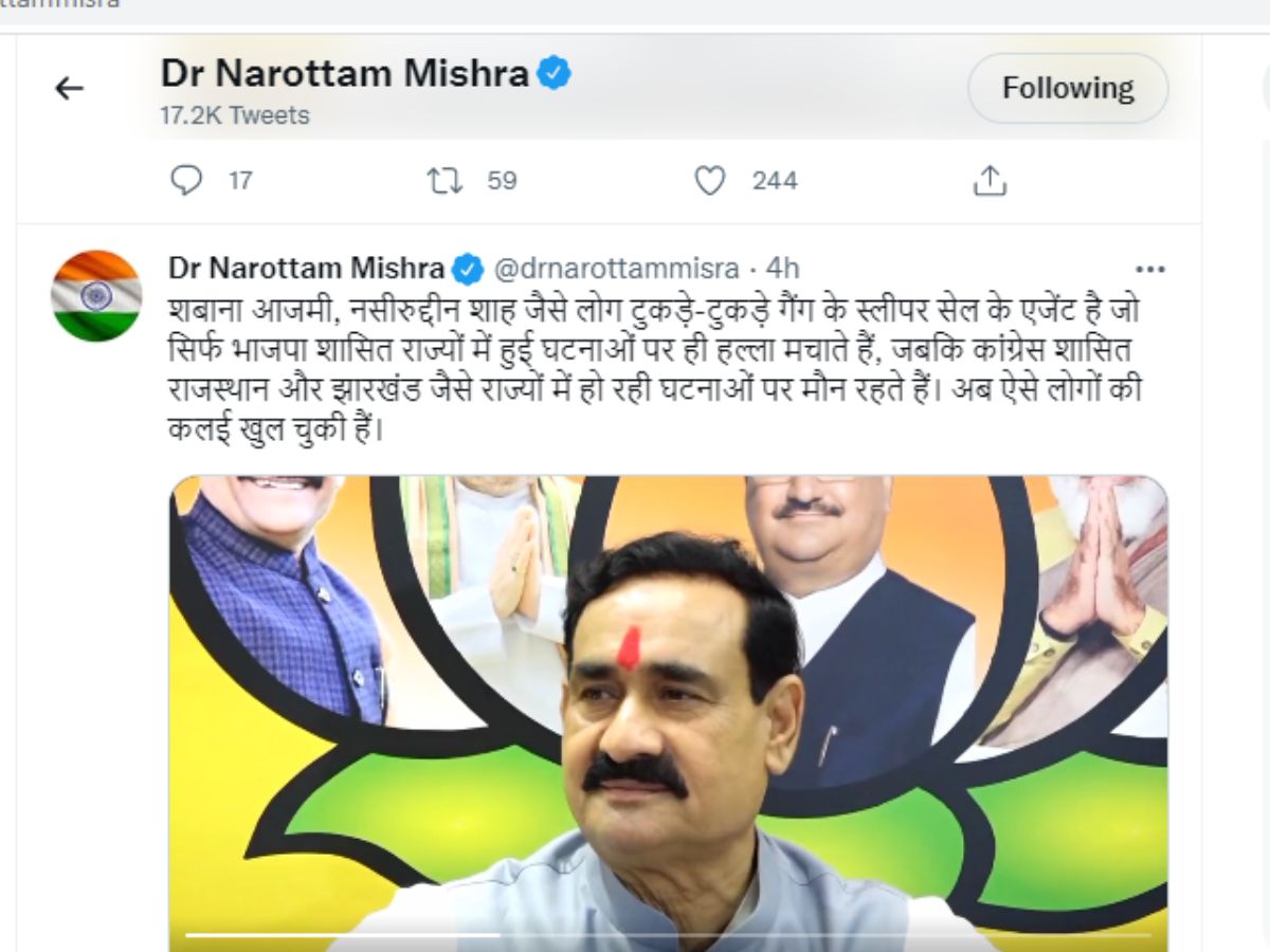 गृह मंत्री नरोत्तम मिश्रा ने शुक्रवार को अपने आवास पर मीडिया से चर्चा में कहा कि शबाना आजमी को बिलकिस बानो का केस तो दिखाई देता है, लेकिन राजस्थान में कन्हैया लाल की हत्या नहीं दिखाई देती. इस पर शबाना आजमी कुछ नहीं बोली. झारखंड में बेटी की जिंदा जलाकर हत्या की गई. इस उस पर इनकी गैंग कुछ नहीं बोली. टुकड़े टुकड़े गैंग को और अवॉर्ड वापसी गैंग को यह सब दिखाई नहीं देता है. मिश्रा ने कहा कि बीजेपी शासित राज्य में कुछ हो जाए फिर देखिए इनको. इन सभी को देश में रहने में डर लगने लगेगा. यह सभी लोग गला फाड़-फाड़ कर चिल्लाने लगेंगे. अवॉर्ड वापसी गैंग भी सक्रिय हो जाएगी.