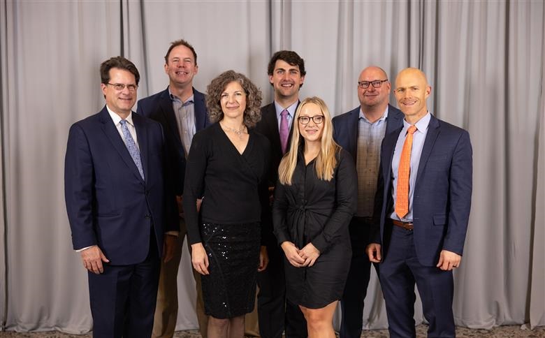 The Syensqo team receiving the safety category award at the 2024 SPE Innovation Awards North America on November 13, 2024, in Detroit, Michigan. From the left: Gregory Poterala, Rik LaBelle, Laura Hirschhorn, Gill Biesold, Alyssa Arend, Patrick Rodgers, and Geoffrey Lindberg.